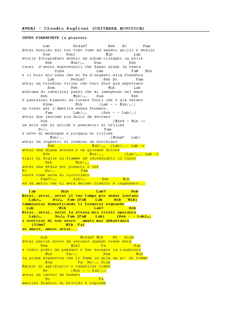Accordi Avrai Baglioni / Spartiti Partiture Baglioni Claudio Assolo Pdf / Testo e accordi della canzone avrai di claudio baglioni.. Claudio baglioni questo piccolo grande amore pianoforte. Scegli la consegna gratis per riparmiare di più. Specifica solamente il nome dell'autore e della canzone. Leggere gli spartiti per chitarra, gli accordi e le tablature mettilo alla prova! Do fa mi lam avrai sorrisi sul tuo viso come ad agosto grilli e stelle mim fa.